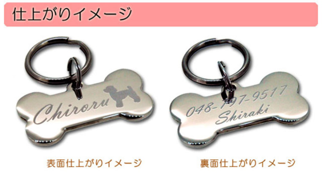 | 刻印について | ・フォント選択【1番・2番・3番・4番・5番・6番・7番・8番・9番・10番】 ・付属品選択【I:ステンレスWリング(S)・J:ステンレスWリング(M)】 ・刻印文字 表面(ペットの名前)【 】 例:チロル 裏面(メッセージなど)1行目【 】 例:迷子です! 裏面(ご連絡先など)2行目【 】 例:050-3568-9517 裏面(オーナー名など)3行目【 】 例:白木 ・シルエットの種類【 】 ※シルエット無しの場合は未記入でOK。 |