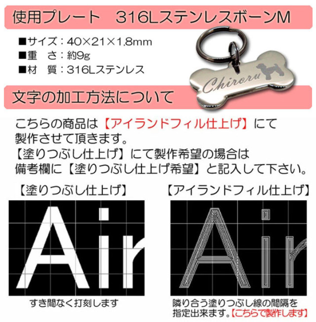 | 商品説明 | ■名称:ステンレスボーン迷子札 ■サイズ:40×21×1.8mm ■重さ:約9g ■材質:316Lステンレス(サージカルステンレス) ■カラー:シルバー |