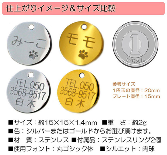 | 刻印について | ・カラー選択【シルバー・ゴールド】 ※刻印文字例 表面(ペットの名前)【 】 例:みーこ 裏面(ご連絡先など)1行目【 】 例:TEL.050 裏面(ご連絡先など)2行目【 】 例:3568-9517 裏面(オーナー名など)3行目【 】 例:しらき ※プレートが小さいため、裏面の電話番号は2行に分けてご指定ください。 |